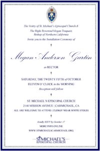 Join us as we celebrate Rev. Megan’s Installation Service as our new Rector here at St. Michael’s!
